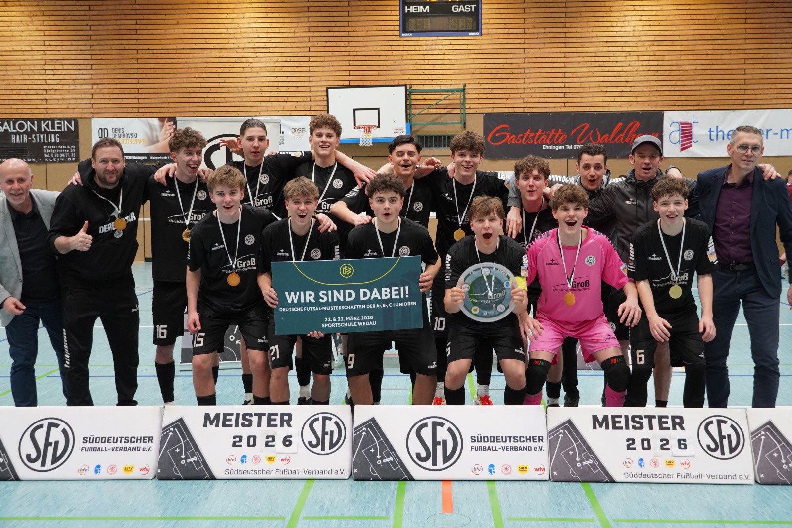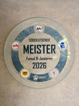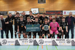 Am 08.03. fuhr die B1-Jugend als Hessenmeister zu den Süd­deutschen Meister­schaften. Abfahrt morgens um 07 Uhr mit dem 9-Sitzer und weiteren Eltern als Unter­stützung. Der Start ins Turnier war super. Nach dem Warmmachen in den neuen Shirts, die uns unser Beflocker Rainer Schmoll geschenkt hat, fand die große Begrüßungsfeier statt. Darin wurde nochmals erklärt, dass sich auch in diesem Jahr bei den B-Junioren zwei Teams für die Teilnahme an den Deutschen Meisterschaften qualifizieren. Im Modus Jeder gegen Jeden ging es dann pünktlich um 11 Uhr los. Und wir fanden super in das Turnier hinein. Nach einem knappen 3-2 Sieg gegen den Freiburger FC (trotz 3-0 Führung) spielte sich die Mannschaft in Spiel zwei in einen Rausch, der durch den sensationellen Fallrückzieher zum 4-0 von Leopold Fraund-Schmidthals gekrönt wurde. Endstand 5-2 Eigentlich hervorragende Ausgangssituation für die Jungs vor den letzten beiden Spielen, aber auch als Trainer macht man Fehler und deshalb nimmt Trainer Martin Fraund die 1-2 Niederlage gegen den SV Böblingen auf seine Kappe. Vor dem letzten Spiel war dann klar: Hop oder Top! Mit einem Sieg bist Süddeutscher Meister - mit einem Unentschieden oder gar einer Niederlage bist du raus, da der direkte Vergleich zählte. Aber die Mentalität unserer Jungs ist in dieser Hallensaison einfach stark. Nach einer einstudierten Ecke erlösten sie die zahlreich mit­ge­reisten bzw. nach­ge­kom­menen Eltern, Geschwister und Freunde. Mit dem 2-0 machten sie kurz danach den Deckel drauf und sicherten sich somit den Titel, sowie das Ticket für die Deutschen Meister­schaften 2026 in Duisburg in der Sport­schule Wedau vom 20.-22.03. Zweimal in Folge Teilname an den Deutschen Meisterschaften - das ist absoluter Wahnsinn und macht den gesamten Verein sehr stolz. Die Jungs leben in dieser Saison ihre eigenen Traum und dürften sich nun fest in den Geschichts­büchern des Vereins verankert haben: Meisterschaftskurs in der Gruppenliga, was dem Verein den Aufstieg in die Verbandsliga ermöglichen würde, Kreis­pokal­sieger, Teil­nehmer im Hessen­pokal und durch zwei Siege bereits für das Achtel­finale qualifi­ziert, FUTSAL Kreis­meister, Regional­meister, Hessen­meister, Süd­deutscher Meister und Teil­nehmer an der Deutschen Meister­­schaft. Welche Träume in den letzten 3 Monaten der Saison noch in Erfüllung gehen werden ent­scheiden einzig und allein die Spieler! Aber Träumen ist ja bekannt­lich erlaubt.
